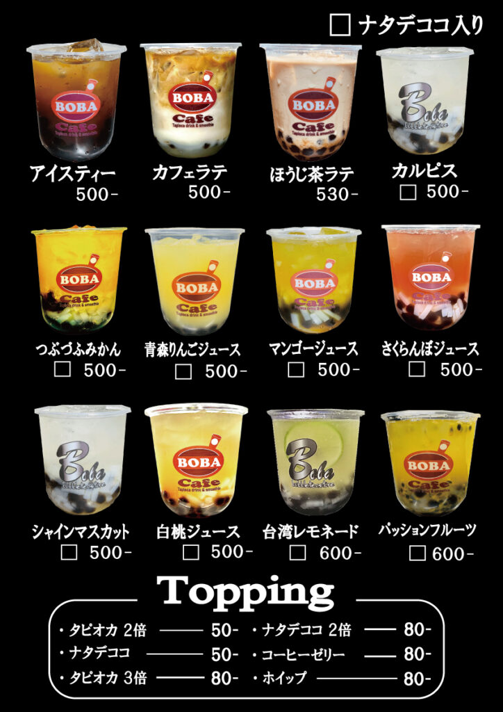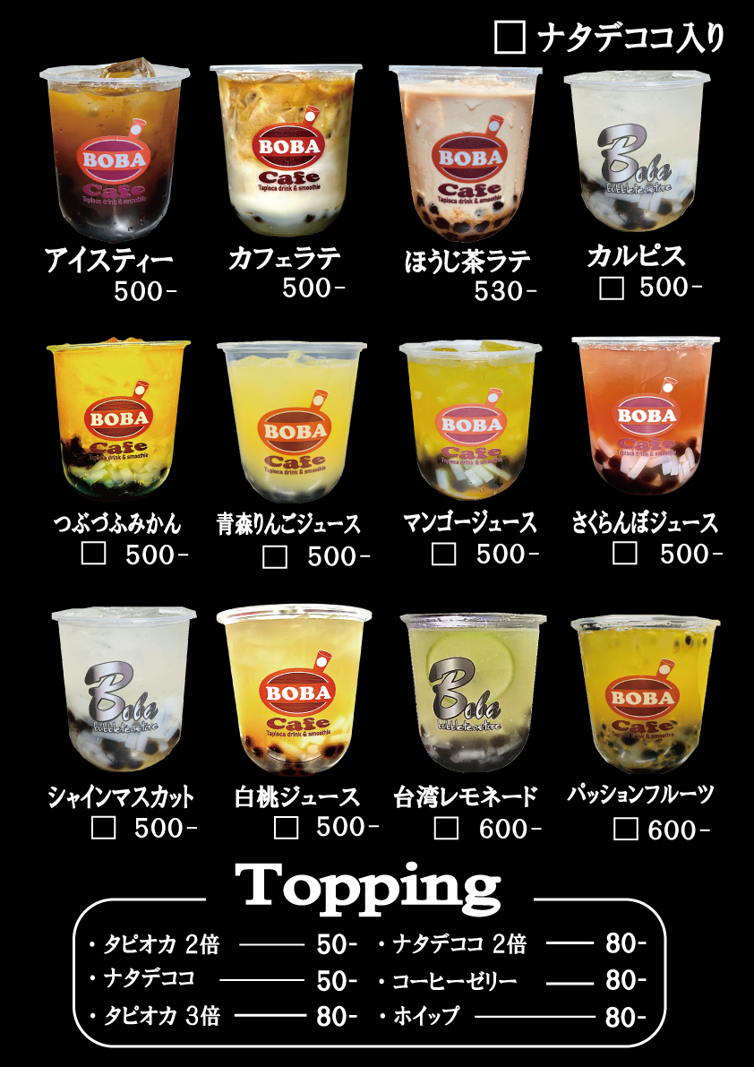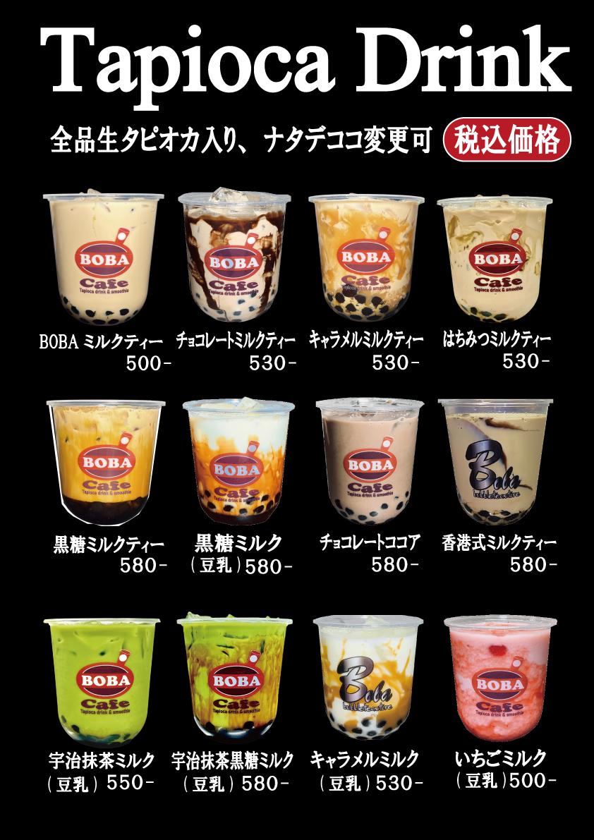 BOBACafeは、からあげとタピオカが同時に味わえる専門店です。皆様に本当に美味しいからあげや、タピオカなどを味わっていただきたいと思い、タピオカは台湾産生タピオカを独自の製法で炊き上げております。からあげは手軽に、楽しく、美味しくをモットーに安心安全な国産鶏肉100%使用しております。他にも豊富なドリンクや、スムージー、サイドメニューを提供しています。テイクアウトでもイートインでもご利用可能ですのでここでしか味わえない商品を是非、ご賞味ください。